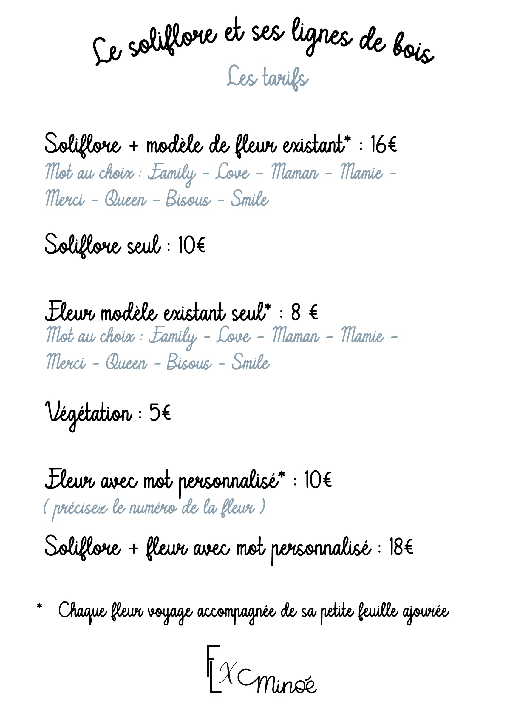 Chaque lot comprend : un soliflore, une fleur à mot doux* et sa feuille.