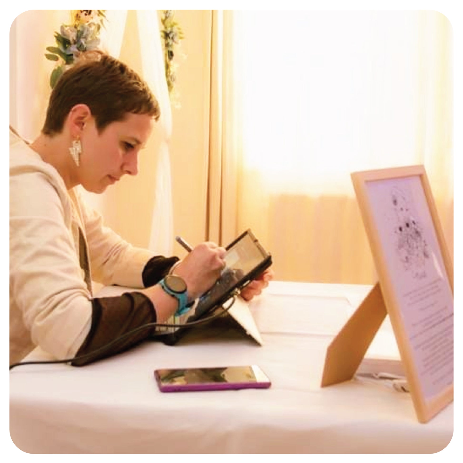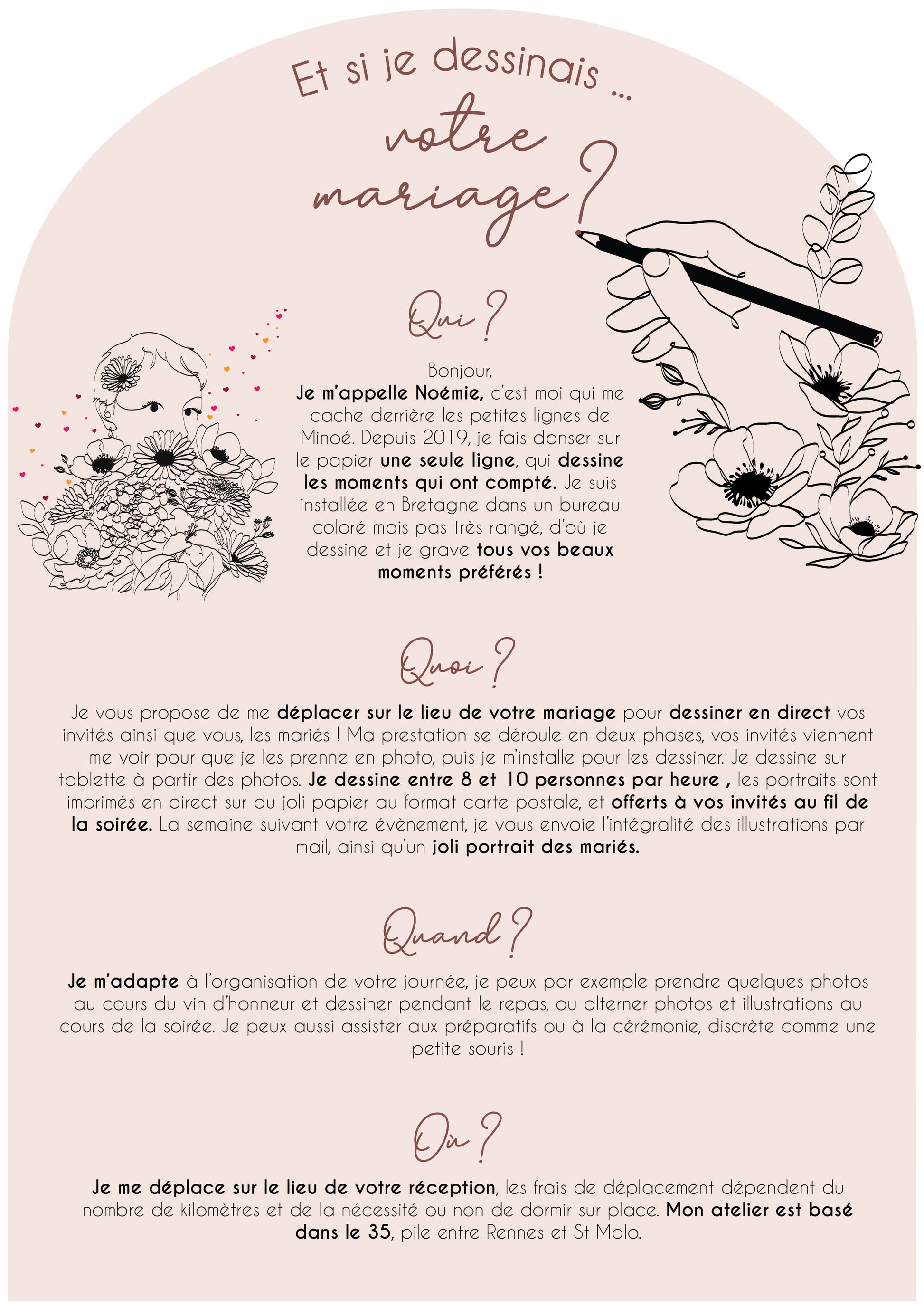 Je vous propose de me déplacer sur le lieu de votre évènement pour dessiner en direct vos invités ainsi que vous ! Ma prestation se déroule en deux phases, je passe discrètement prendre des photos de vos invités si joliment habillés, puis je m’installe pour les dessiner. Je dessine sur tablette à partir des photos prises plus tôt. Je réalise une dizaine de portraits par heure, qui sont imprimés en direct sur du joli papier au format carte postale, et offerts à vos invités au fil de la soirée. La semaine suivant votre événement, je vous envoie l’intégralité des illustrations par mail, ainsi qu’un joli portrait des mariés par exemple, s'il s'agit d'un mariage.