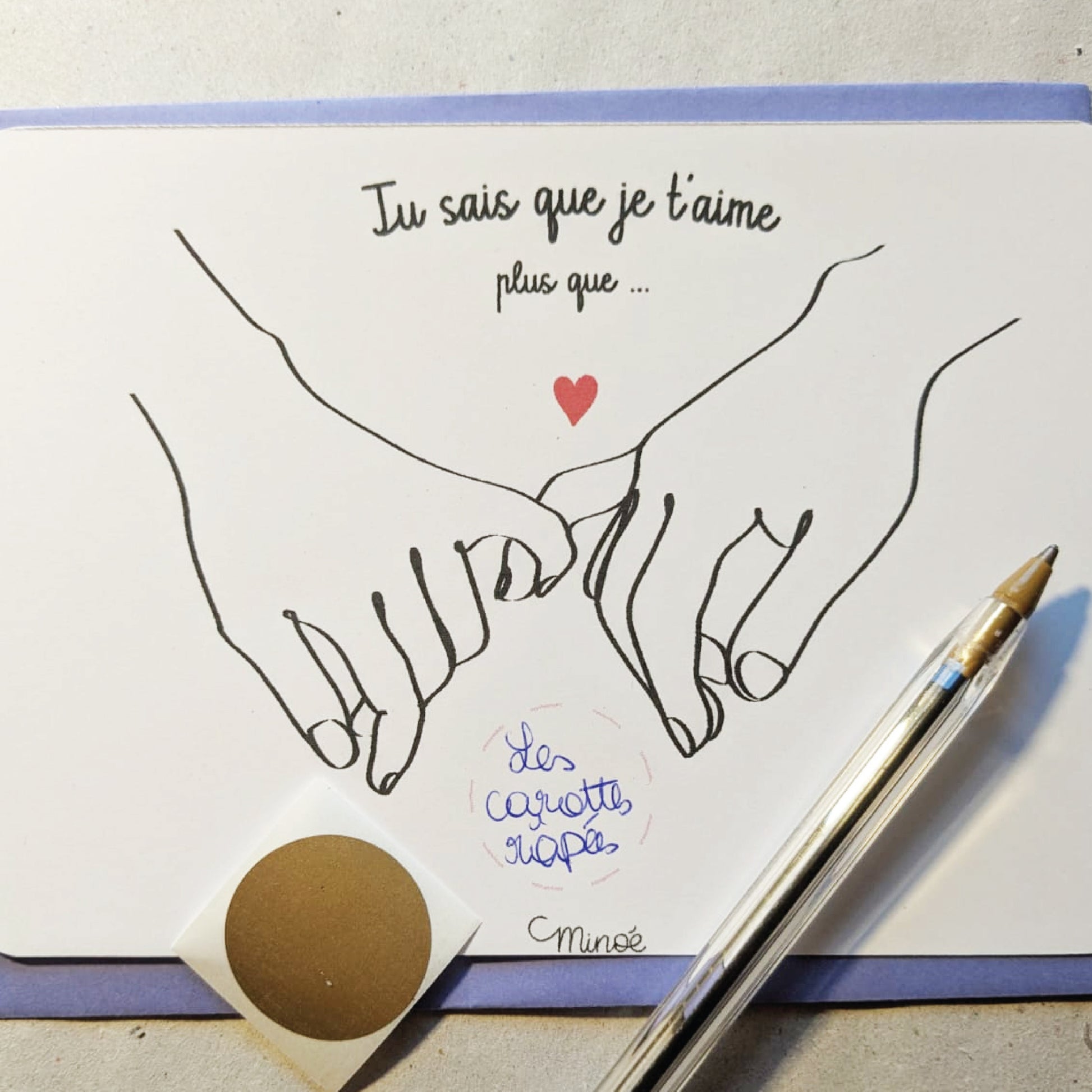 Les deux versions sont disponibles avec les mains en coeur ou les petits doigts entrelacés, l'enveloppe colorée est fournie. Format carte postale uniquement.