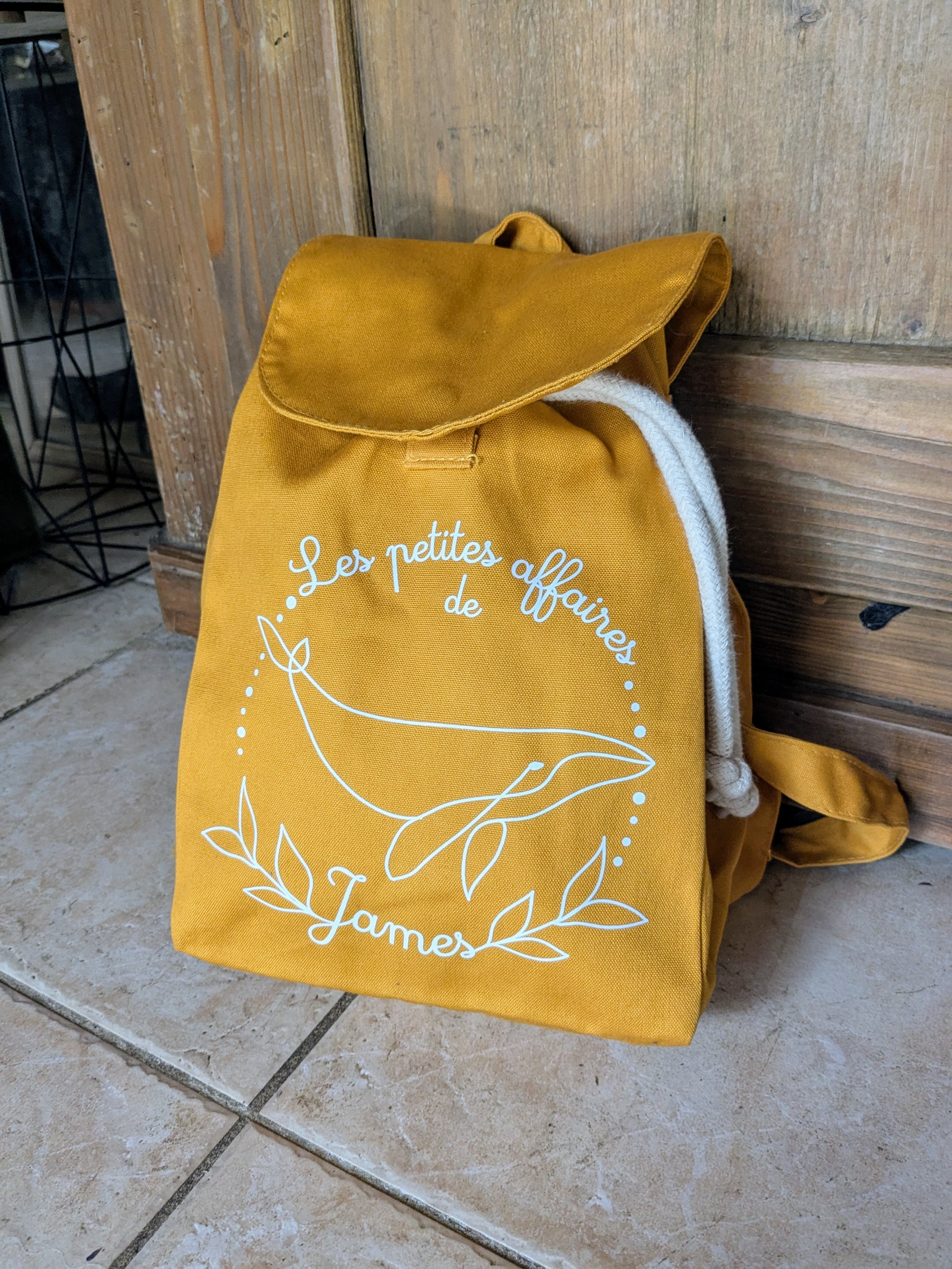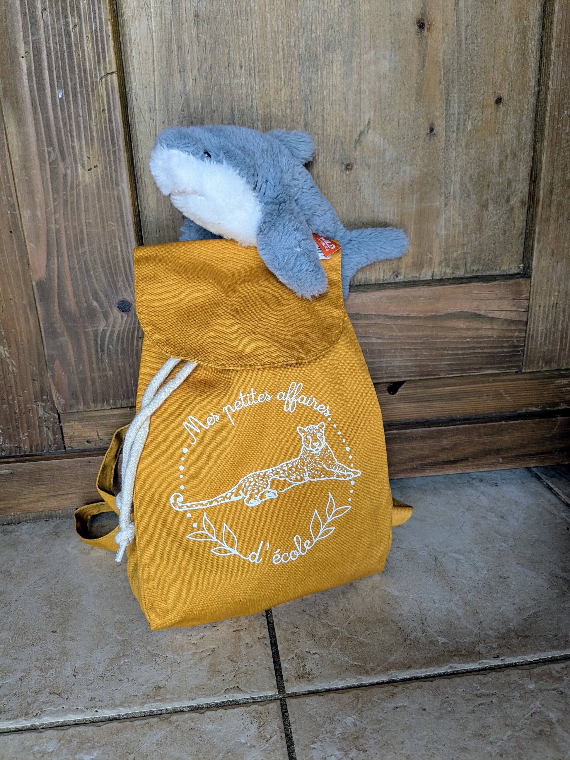 Quelques détails techniques : Le sac est en 100% coton bio, et mesure 22x30x12cm. On y met facilement une gourde, un goûter, un doudou et des vêtements de rechange. Le sac est idéal pour les trois années de maternelle, ou pour la crèche / nounou. Il est en canva de coton ( bio ) résistant ( grammage 340g )