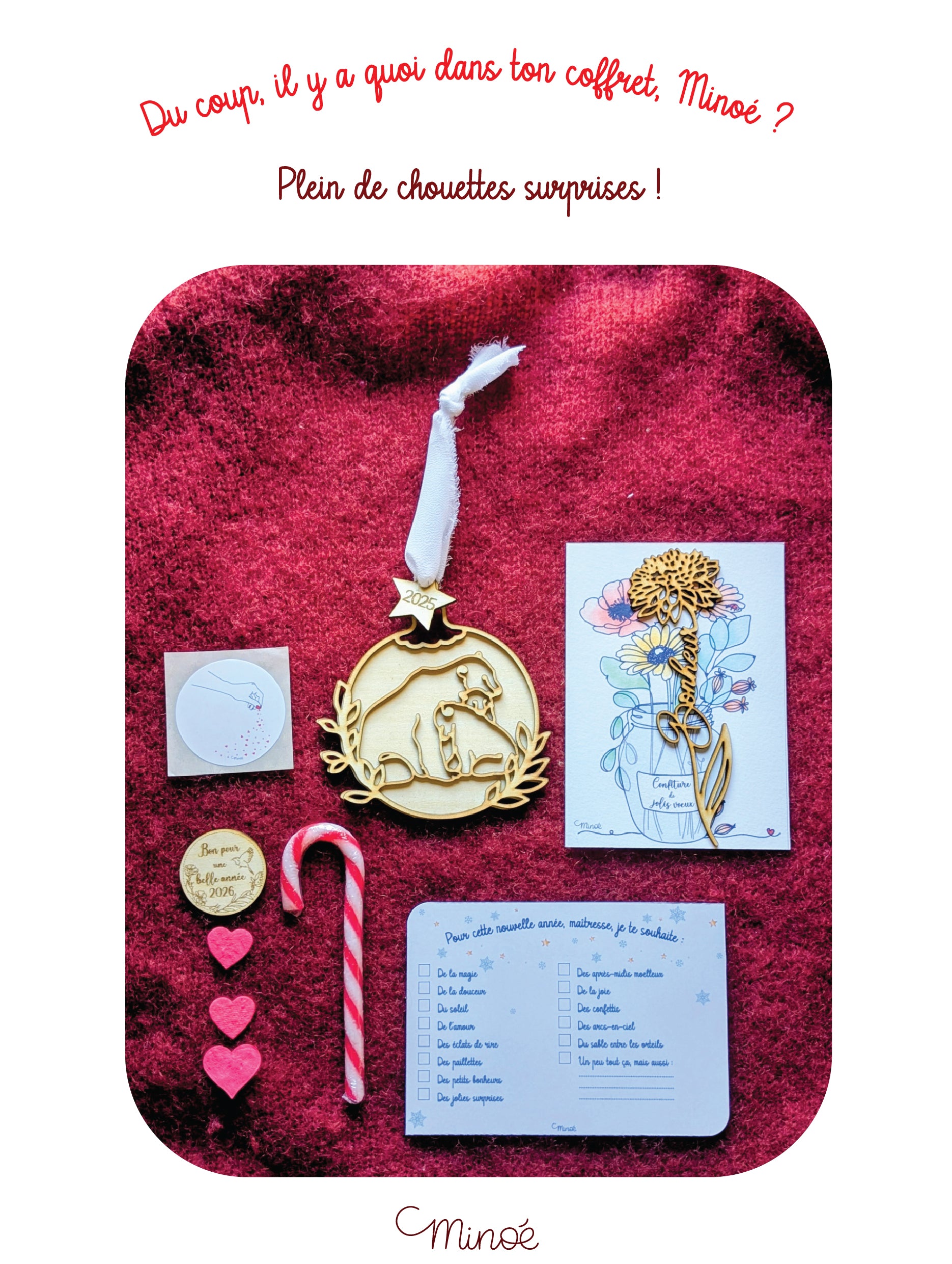 Les coffrets sont joliment composés dans un petit carton mignon, prêts à être complétés ( pour la carte de voeux à cocher ) et offerts, Minoé prend soin de ta charge mentale en cette fin d'année !
