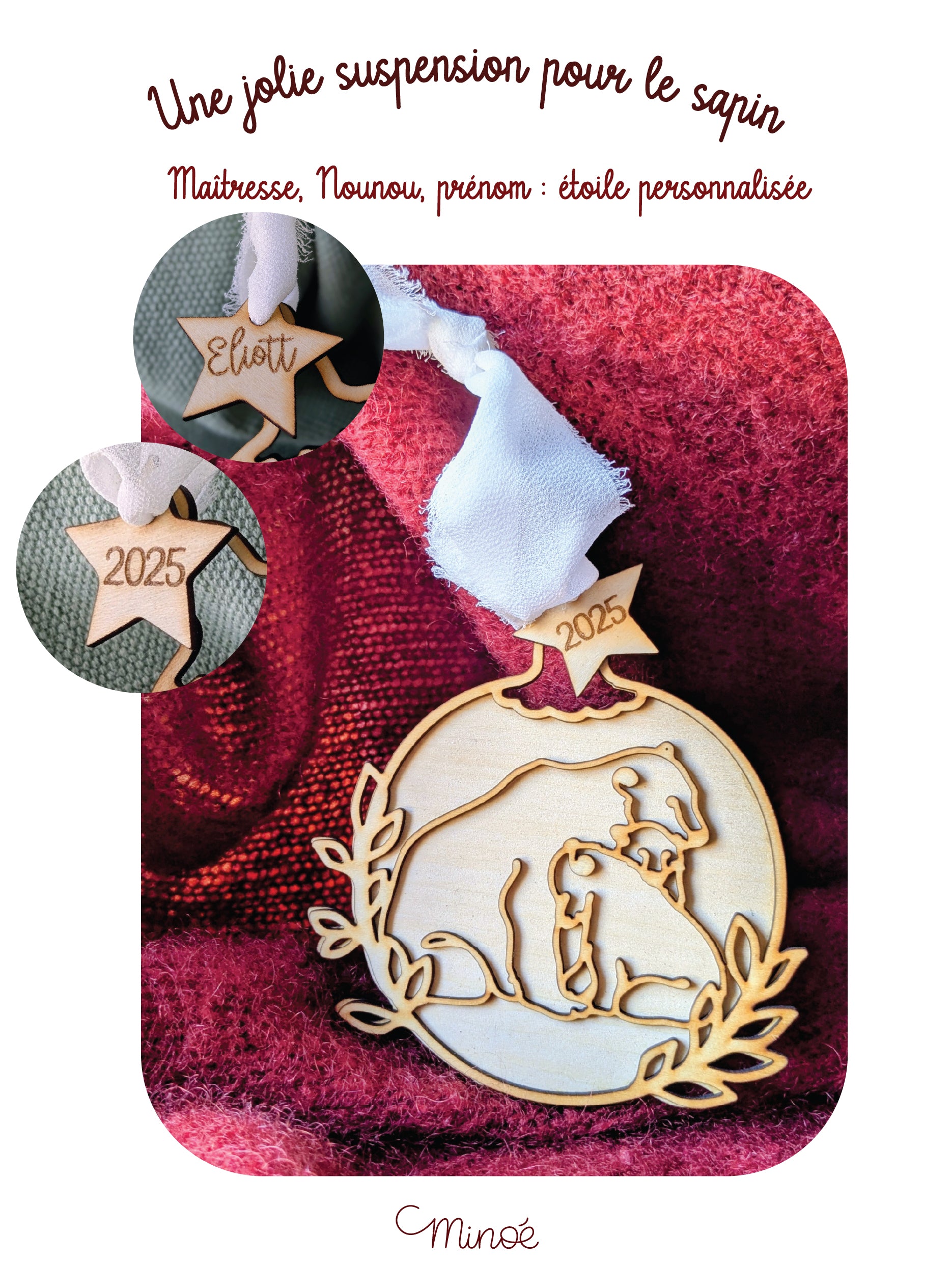 Certains éléments peuvent être personnalisés : L'étoile de la suspension et le petit mot de la carte à cocher !