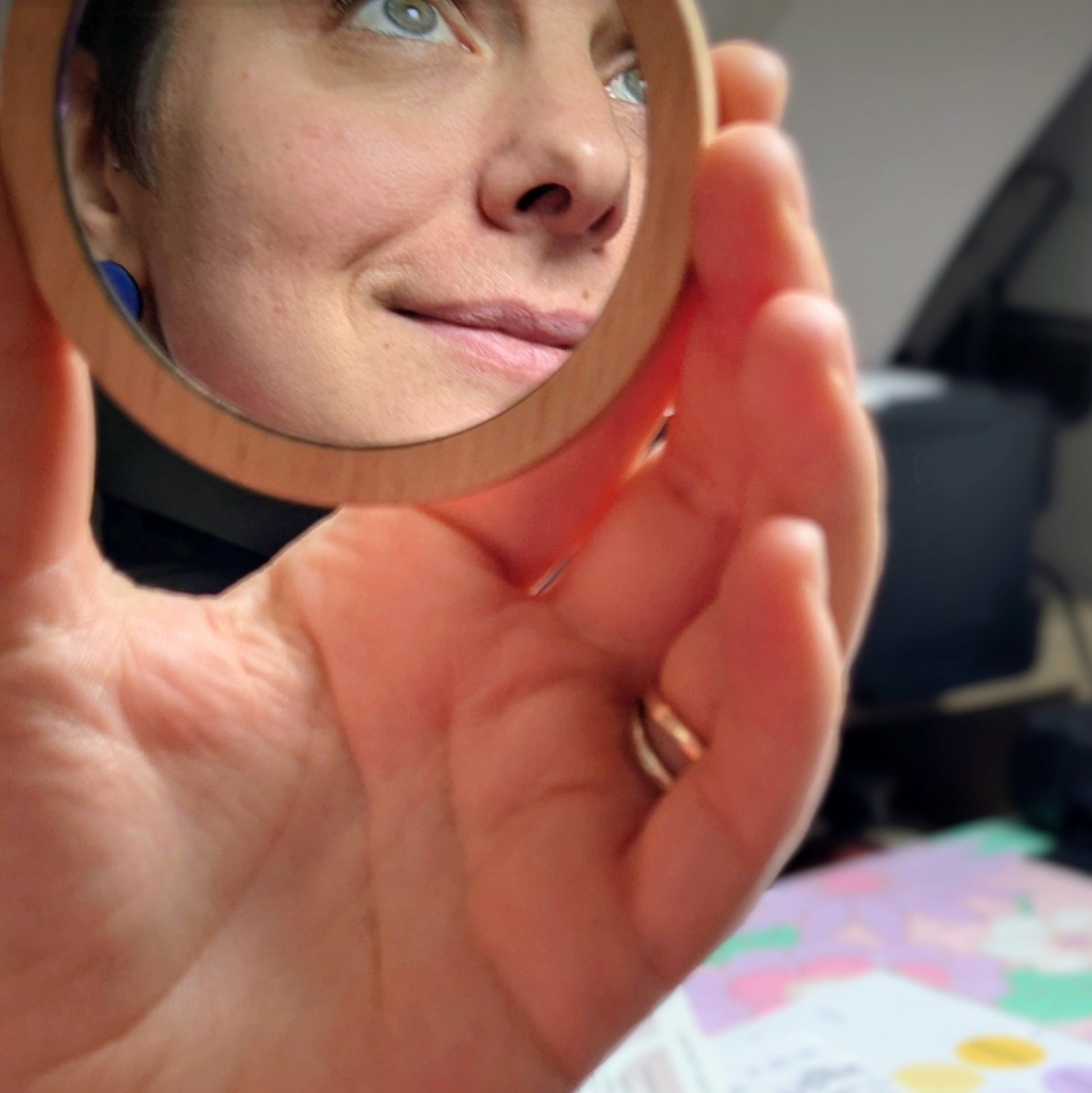 Miroir gravé - dimensions 7.5 cm de diamètre - Possibilité d'ajouter un prénom dans la continuité de la ligne du bas de la main gauche.