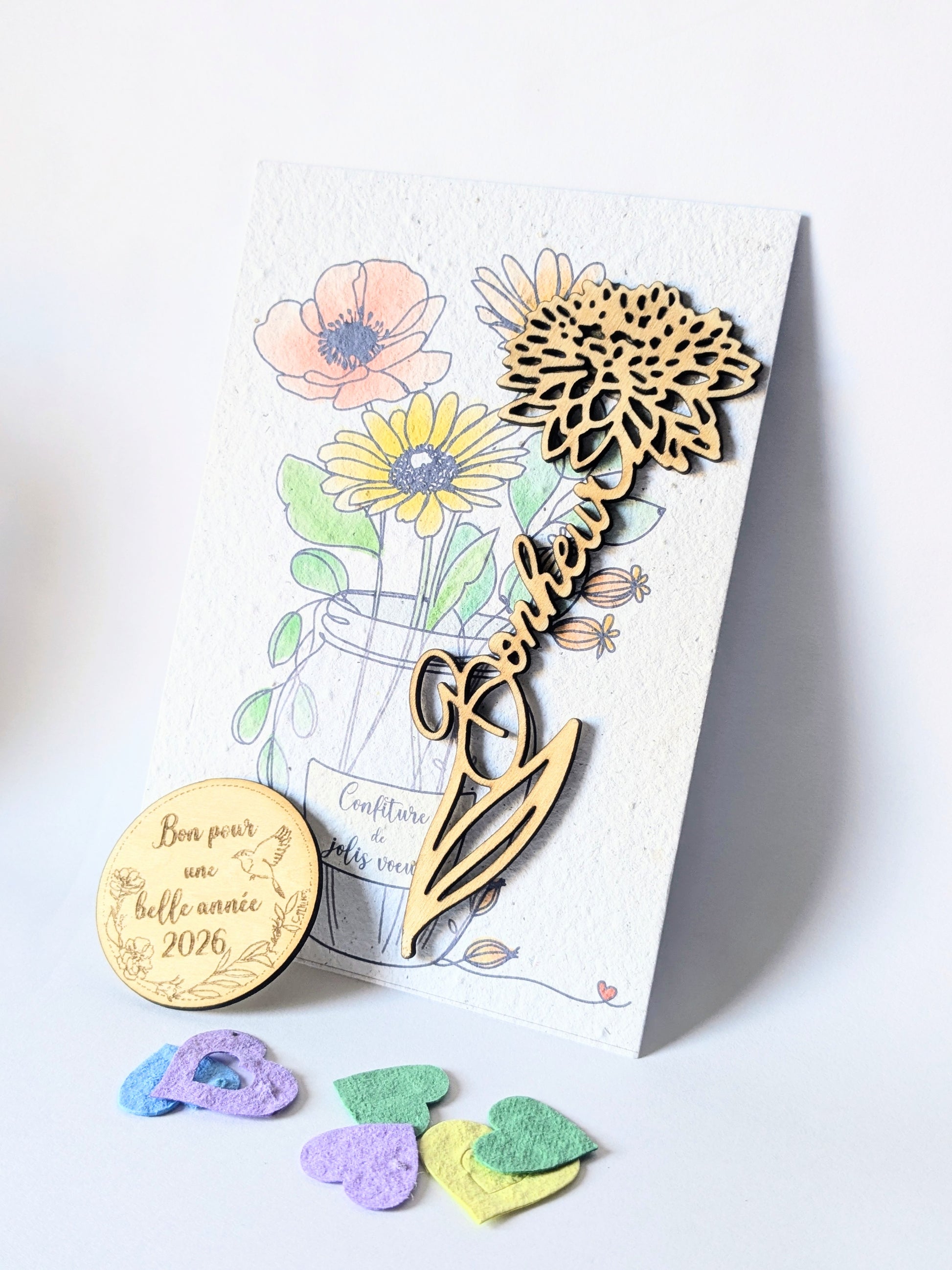 De la confiture de jolis voeux, une fleur de bonheur, un joli rappel et des confettis pour faire pousser des fleurs de toutes les couleurs, une jolie carte à planter bien accompagnée pour souhaiter une belle année !
